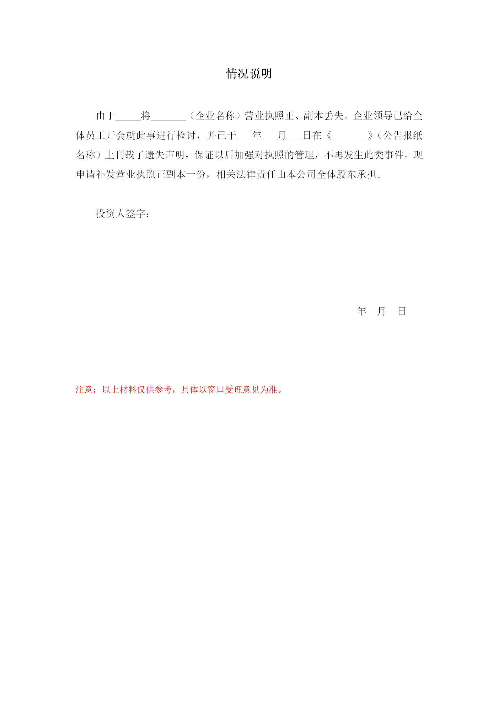 营业执照正、副本丢失情况说明