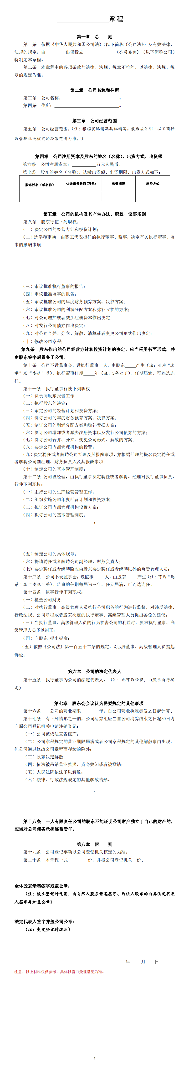 一人公司章程(203不设董事会不设监事会)