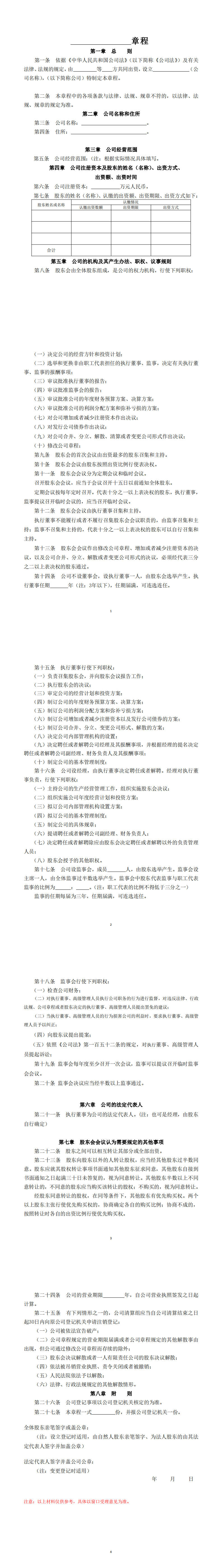 有限公司章程(104不设董事会设监事会)