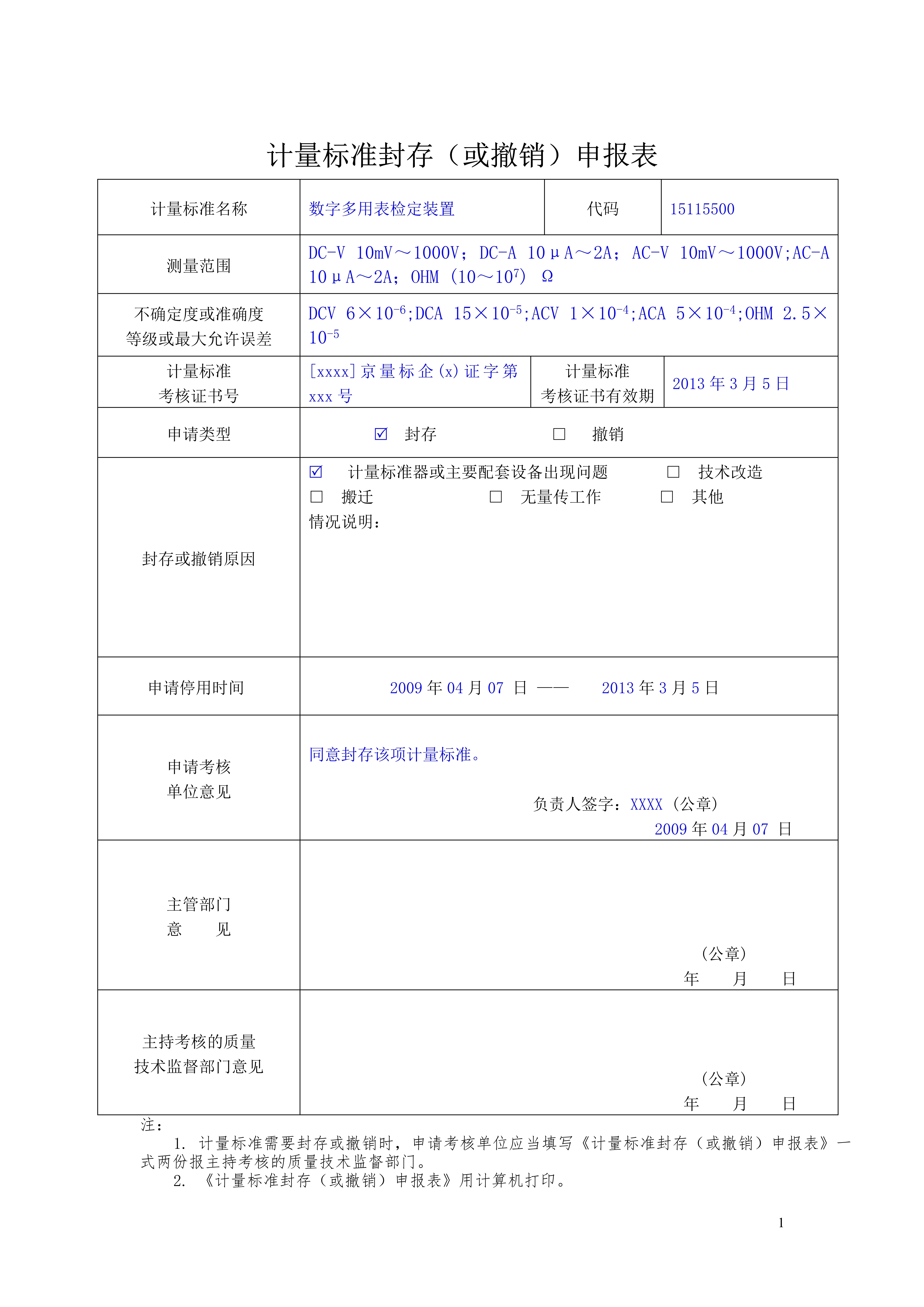 计量标准封存(或撤销)申报表填写要求及示范文本_市场监管