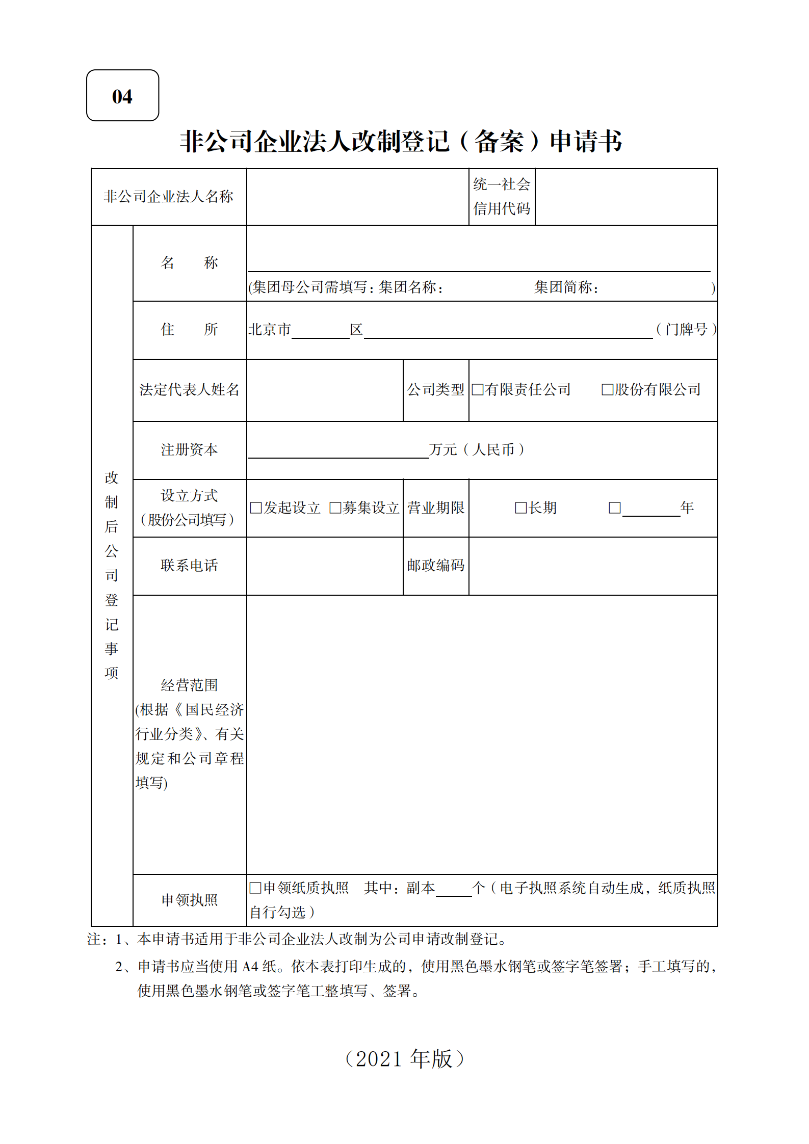 (2021版)非公司企业法人改制登记(备案)申请书