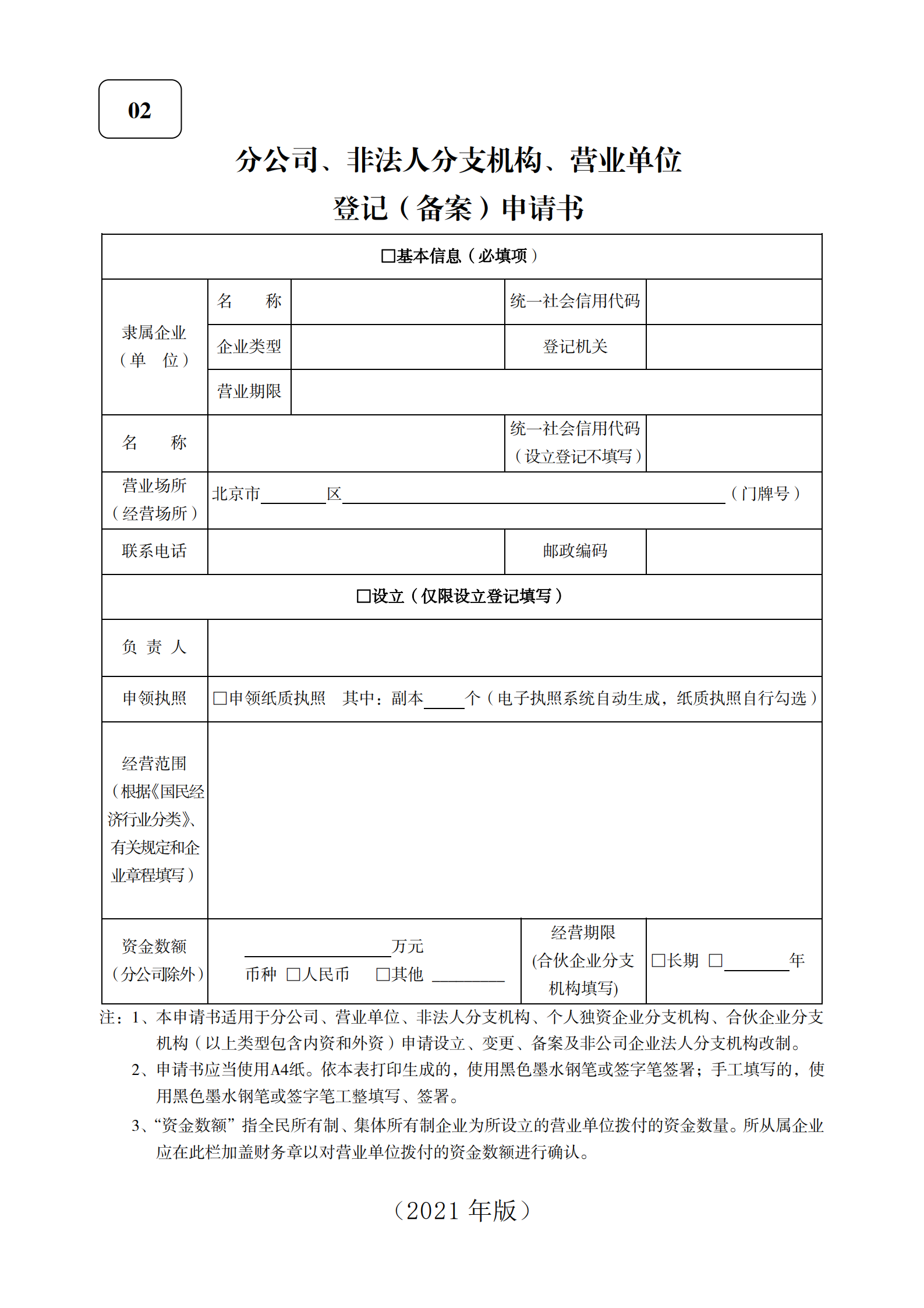 (2021版)分公司、非法人分支机构、营业单位登记(备案)申请书