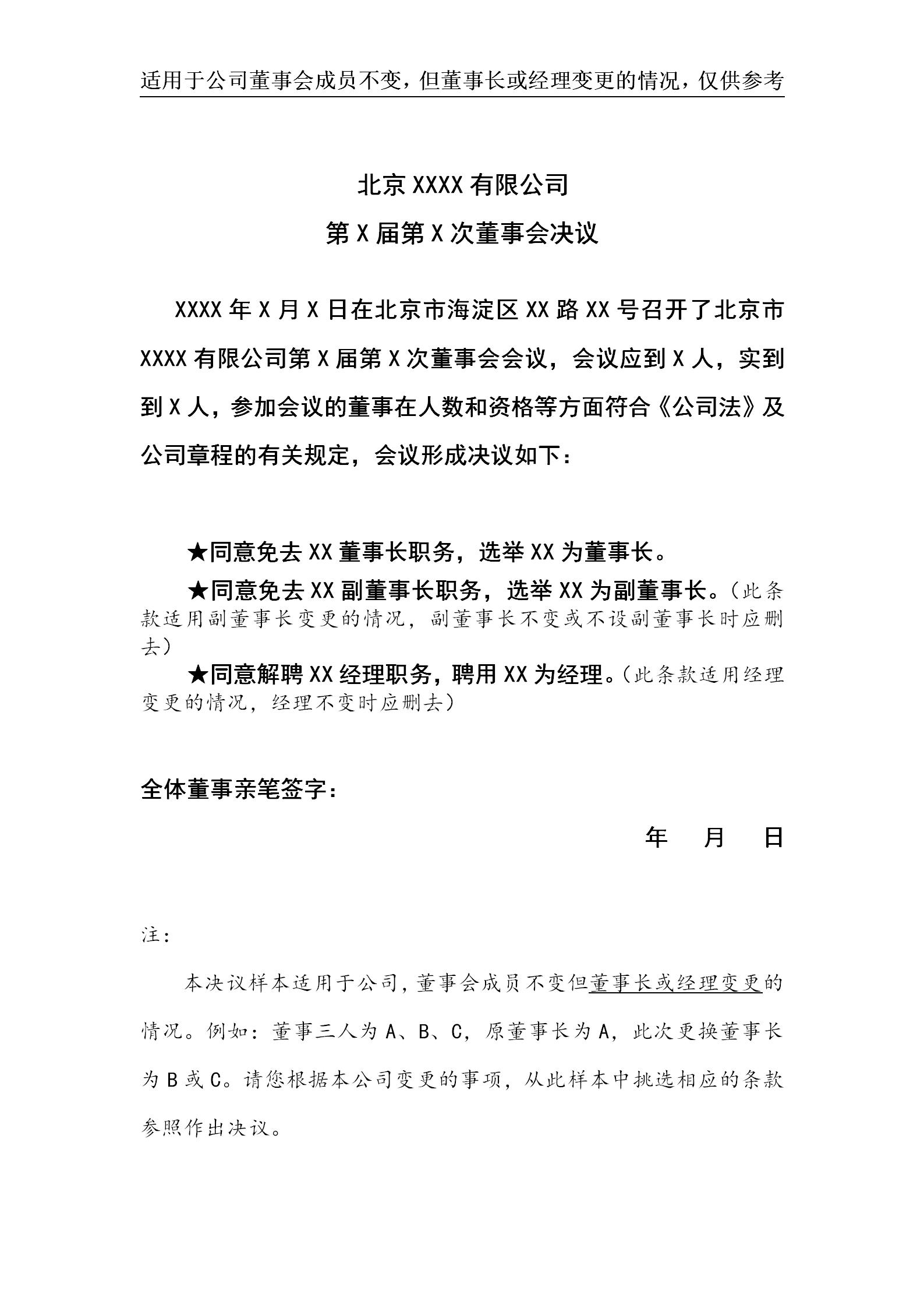04董事会决议参考格式(适用董事不变、董事长或经理变更的情况)
