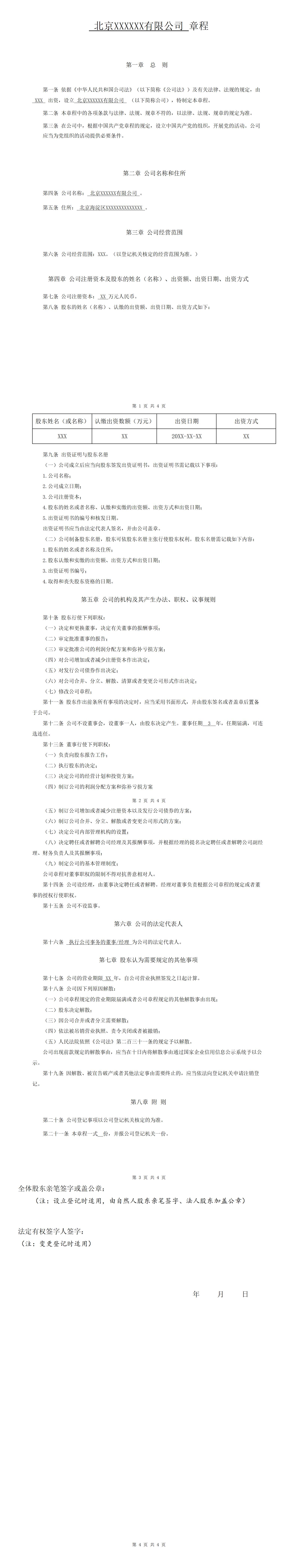 一人有限公司章程(不设董事会不设监事)