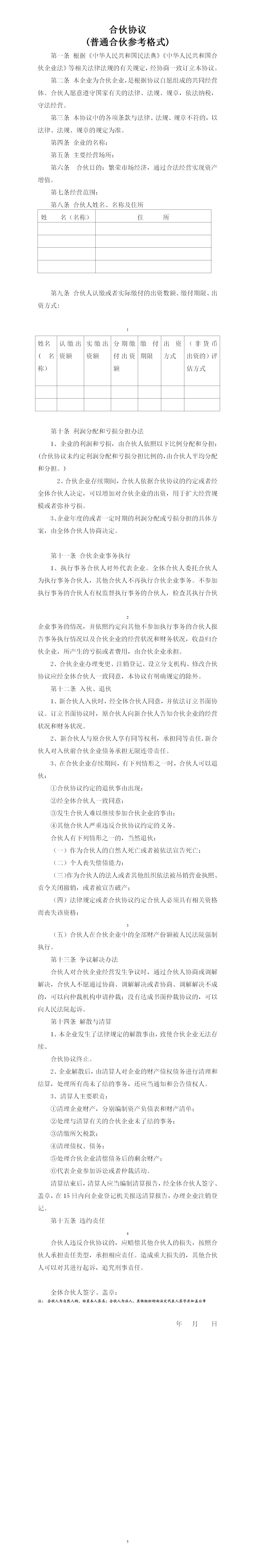 普通合伙企业合伙协议参考格式